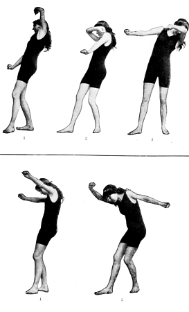 Simple music is played to which the pupils march. As they grasp the beat they mark it by an accented step; when this becomes easy, the corresponding arm movements are added, and the strong beat, at this stage always the first, is marked by full contraction of the arm muscles. Practice is given until at hopp the pupil can stop suddenly, discontinue accenting with one or both arms or with one or both feet, substitute an arm-movement for a foot movement, insert an extra accent either with arm or foot, or do any similar thing previously agreed on. By repeated practice of such exercises complete automatic control of the limbs is obtained and the ground prepared for more advanced work. It is at this stage that the simple movements to indicate times and notes are learnt; they may be [Pg. 41]likened to the alphabet of the method, the elementary exercises as a whole being its accidence, the more advanced stages, including plastic expression, its syntax.