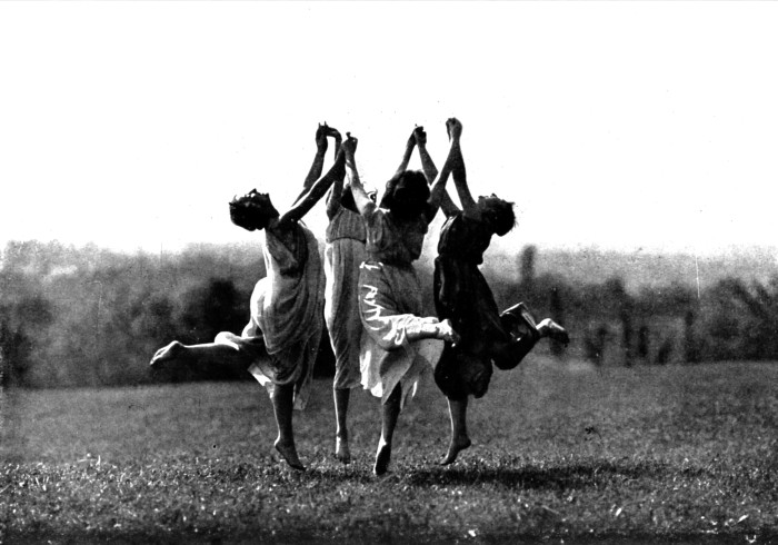 [2] A good example of the fertility and variety of the individual effort obtained at Hellerau was seen at the Aufführung given on December 11, 1911. Two pupils undertook to realize a Prelude of Chopin, their choice falling by chance on the same Prelude. But hardly a movement of the two interpretations was the same. The first girl lay on the ground the whole time, her head on her arm, expressing in gentle movements of head, hands and feet, her idea of the music. At one point near the end, with the rising passion of the music, she raised herself on to her knees; then sank down again to her full length.