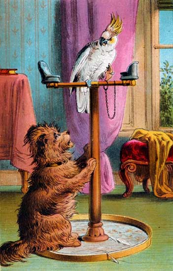 "I really cannot tell you, sir," said Polly. "I have heard the old bird-stuffer telling people I was a native of Western Africa, but whether that was true or not I do not know. All I can recollect of my first home was sitting beside an old parrot like what I am myself now, who, I suppose, was my mother; and on looking round, I saw a strange animal glaring at me from the trunk of the tree behind. I[Pg 63] fluttered and screamed, but my mother did not seem to fancy there was any danger, till, all at once, she was pounced upon by the animal, and dragged away, and I never saw her more. Then I crept back into the nest, and lay half-dead with fright, moaning and crying at times for very loneliness; but she never came. And even now, Master Herbert—would you believe it?—I keep thinking of that dreadful time, and I have to shriek out for some relief to my feelings. You often ask me what I am crying for, but you will know now. And you often wonder why I won't be friends with the cat, and try to bite her when I get a chance. Well, the animal that stole my mother was so very like a cat, that I cannot help hating everything that looks like one.—But don't you think, sir, Mr. Cocky is staying out beyond his time. I am not sure of him, sir. Re[Pg 64]member, by his own showing, he was an ill-behaved, ungrateful bird in his youth."