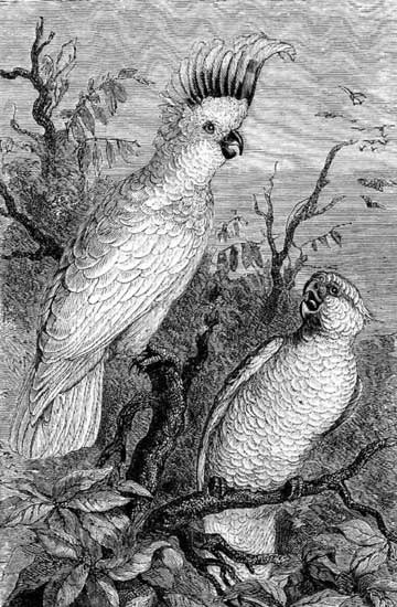 "You said some time ago, Master Herbert," began the cockatoo, "that I[Pg 24] was brought from the Indian Islands; and I suppose you're right, sir, though I can't say I ever heard the name before to-day: all I can say is, I remember the place well. When I popped my head out of my shell, I found other three heads had done the same, so I was the youngest of my family. A sad circumstance for me, as you will see. There we lay, without a single feather, and not even a particle of down to cover us, our heads feeling far too large[Pg 25] for our naked bodies. We had to be as patient as we could, down in our nest in an old rotten tree, till the down began to come; but it was three or four months before we were fairly covered with feathers. Somehow, being the youngest, my feathers were longer of coming than were the others; and when our mother was out of hearing, my brothers would laugh at me, and make fun of my big head—for it certainly was a very large head. This treatment spoiled my temper, and I would sit and sulk by myself, taking a delight in refusing to join in any of their sports when a fourth was required. I used to creep up to the top of the tree, and sit trimming my feathers, spreading them out and trying to make the most of their scanty appearance, till my patience was rewarded; for beyond a doubt, at the end of the fifth month my plumage was[Pg 26] something wonderful to behold for beauty. As for my head being large, it now helped to show off the splendid yellow crest; and the awkward look was quite gone. Still my temper hadn't improved; indeed I think it was worse, for conceit was added to my other bad qualities; and when I would have liked to be amiable and join the merry flock of cockatoos that lived in the trees near us, they would have nothing to say to me. My mother used often to moan and vex herself about me, and she did her best to keep as near me as she could, warning me that it was not safe for a cockatoo to wander far from his home. And then she would tell me of wonderful escapes she had made in her day, both from wild animals and the snares of wicked men. Though these stories frightened me terribly, I must own, making my crest stand up with fright to hear her, still I[Pg 27] used to beg her to tell me more, for it was often a change from the dull hours I spent; and I must say my mother behaved in a most amiable manner towards me.