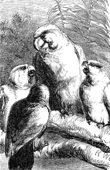 "Well, sir," continued Polly, "as I sat looking out of the nest in the tree, another parrot came and sat beside me, asking all sorts of questions as to where my mother had gone; and when I told him, he stayed and took care of me. I suppose he must have been my father. But before I was[Pg 65] many months older, I was knocked down off the tree, just in the same way as Cockatoo says his mother was knocked down, and I was put into a cage and carried away along with ever so many birds. I've scarcely any recollection of living out of a cage, sir, or off a perch, the time I stayed in my native woods being so short, and so very long ago."