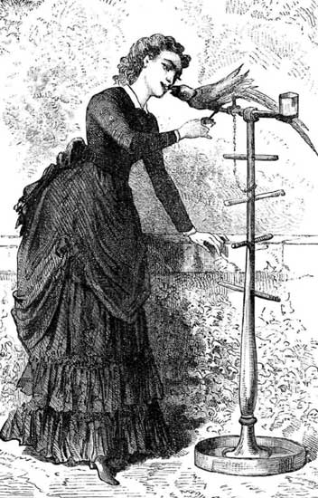 "Oh, very well indeed, sir," she replied. "I had plenty to eat and drink, and a very fine brass cage to live in, and a servant to attend to my wants along with the other birds my mistress had. I cannot say I was ever troubled with a restless disposition,—owing, I suppose, to my having been taken from my native land when I was so very young,—and I always felt very happy. My mistress took[Pg 66] a great deal of notice of me, teaching me a great many things, and particularly songs. I used to sing a verse of an old song called 'Crazie Jane,' and another called 'The Maid of Lodi,' which used to be a great favourite with my mistress; and when I saw her coming in with some dainty bits from the dessert after dinner, I used to dance about my perch, and cry out,—