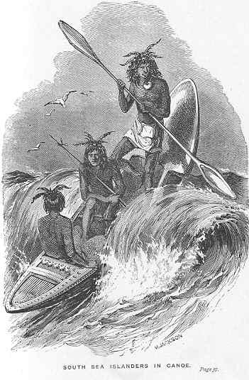The famous “Rob Roy” canoe, which is now so much in vogue among boys and young men of aquatic tendency, is constructed and managed on precisely the same principles with the Eskimo kayak; the only difference between the two being that the “Rob Roy” canoe is made of thin wood instead of skin, and is altogether a more elegant vessel. An account of it will be found in our chapter on “Boats.” The South Sea islanders also use a canoe which they propel with a double-bladed paddle similar to that of the Eskimos. They are wonderfully expert and fearless in the management of this canoe, as may be seen from the annexed woodcut.