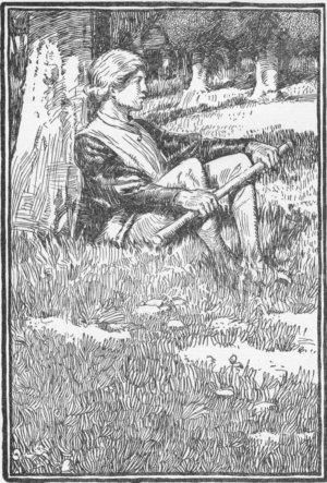 On one side of the moat was a large wood, and here Arthur spent a great deal of his time. He liked to lie under the trees and gaze up at the blue of the sky. All about him old oaks stood like giant guardians watching sturdily over the soil where they had grown for centuries. Arthur could look between the trunks and see rabbits and squirrels whisking about. Sometimes a herd of brown deer with shy dark eyes would pass, holding their graceful heads high in the air; sometimes a flock of pheasants with brilliant plumage rose from the bushes. Again there was no sound except the tapping of a bright-crested woodpecker, and no motion but the fluttering of leaves and the trembling of violets half buried in green moss.