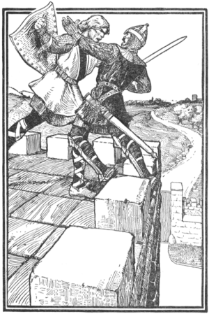 Day came, but no sun. A cold white mist lay over land and sea. It chilled the knights to the bone. And when the battle began, the mist was so thick that no one could see with whom he was fighting. Friends slew each other, not knowing whom they killed. Some could not fight at all, for it seemed to them that those moving on the battle-field were ghosts of warriors long since slain. There was many a noble deed and many a base one done in that mist.