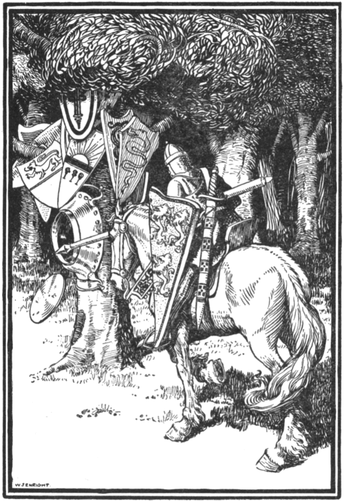 "I rode happily, planning all the great[250] victories I should win. I was sure if I righted a great many wrongs, I should soon see the Grail. But after many days I began to grow weary. I was riding through rough forests, and the branches bruised me and my horse; there seemed to be no great deeds to do. I could not even slay wild beasts, and so be of use to the poor country people. My bed was on the hard ground, and my food was wild berries.