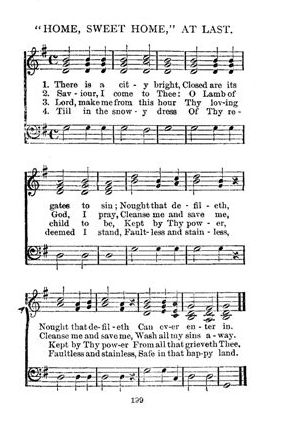 "Are you one of those blessed ones?" asked the clergyman. "Are you washed in the blood of the Lamb? Will you sit down to that supper? Have you a right to enter into 'Home, sweet Home?' I know not what is your answer to these questions. But if you cannot answer me now, how will you in that day answer the Great Searcher of hearts?"