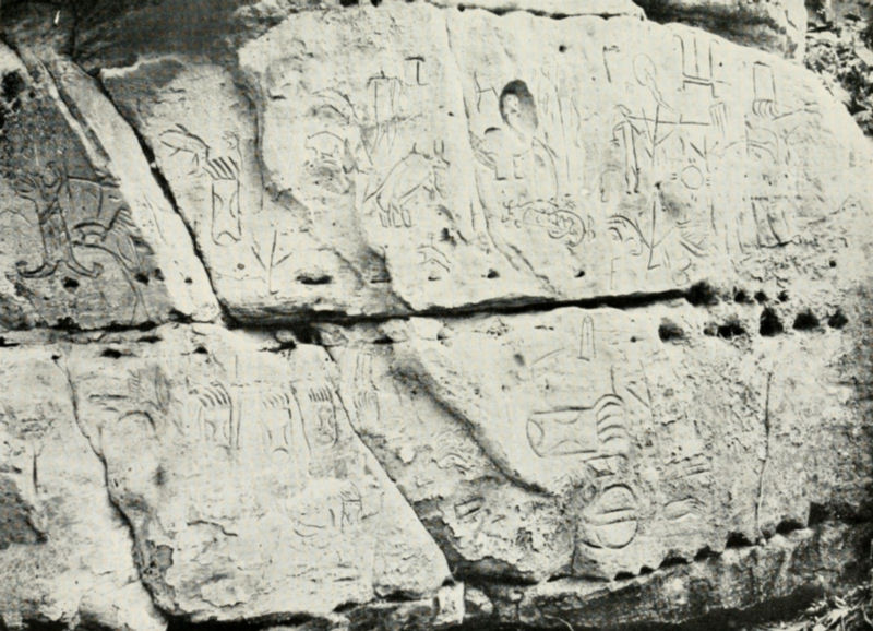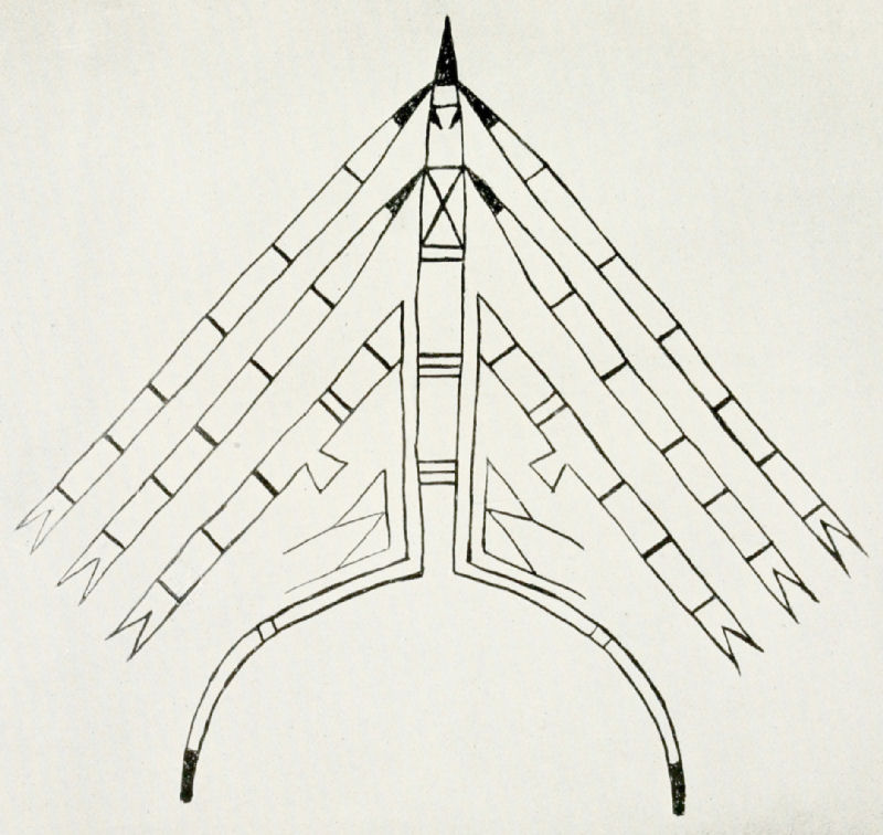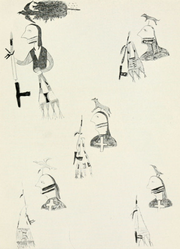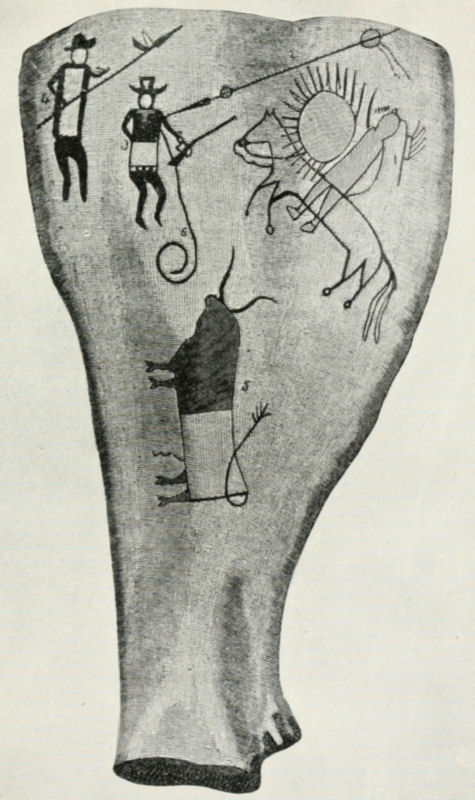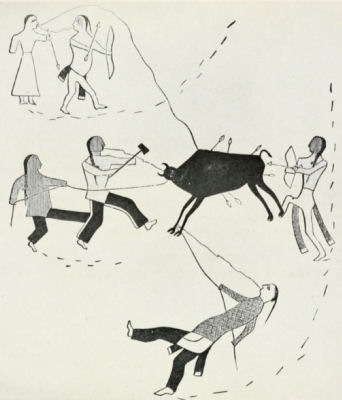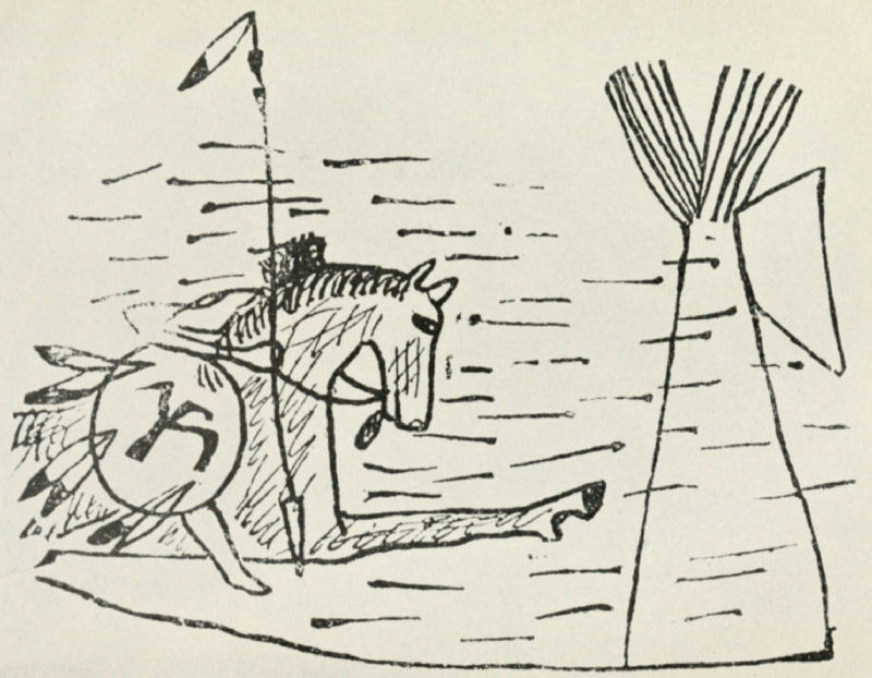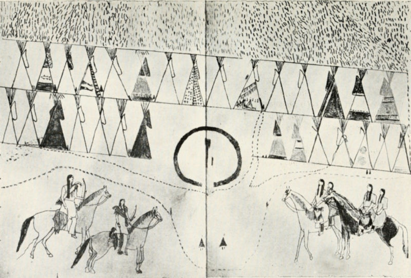 The vision of one of the dreamer priests is represented. After reaching the spirit world, Bianki found himself on a vast prairie covered with innumerable buffaloes and ponies. He went through the herds (dotted lines) until he came to a large Kiowa camp, with its ornament tepees. He met four young women who had died years before, and asked about two of his brothers, also dead. He soon met them coming into camp, with buffalo meat hanging from their saddles.