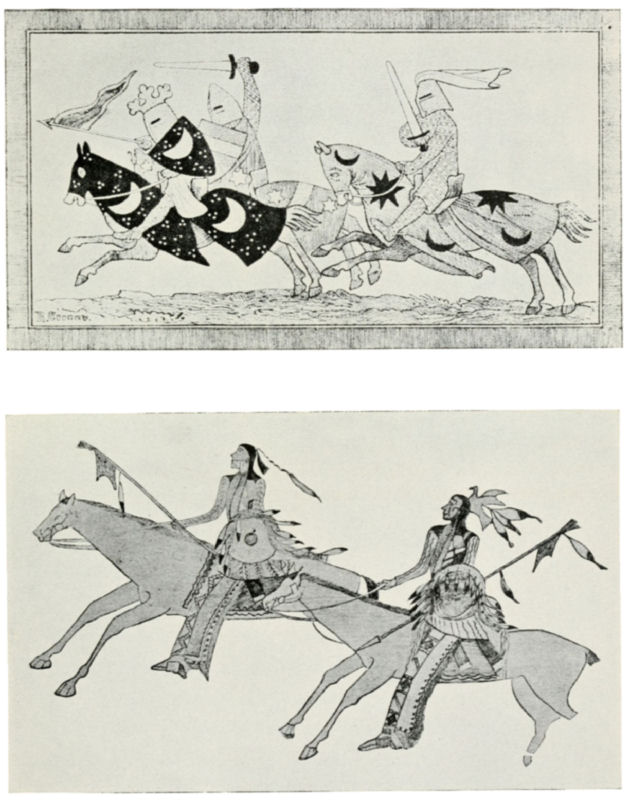 Here, amidst the vast sweep of the plains which stretch away to the horizon on every side, boundless, limitless, endless, lived the plains Indians. Standing in the midst of this vast green plain on a soft May morning, after the Thunder Gods have passed, when the sun is shining in the soft blue above, and the sweet, rain-swept air is blown about by the Four Winds which are always near to man, day and night,—standing far out on the plains with no hint of the white man or his work—one sees the earth somewhat as the Indian saw it and wonders not at his reverence for the Mysterious One who dwelt overhead, beyond the blue stone arch, and for the lesser powers which came to him over the four paths guarded by the Four Winds. It was Wakoda, the Mysterious One, who gave to man the sunshine, the clear rippling water, the clear sky from which all storms, all clouds are absent, the sky which is the symbol of peace. Through this sky sweeps the eagle, the “Mother” of Indian songs, bearing upon her strong wings the message of peace and calling to her nestlings as she flies. Little wonder that to some tribes song was an integral part of their lives, and that emotions too deep for words were expressed in song.
