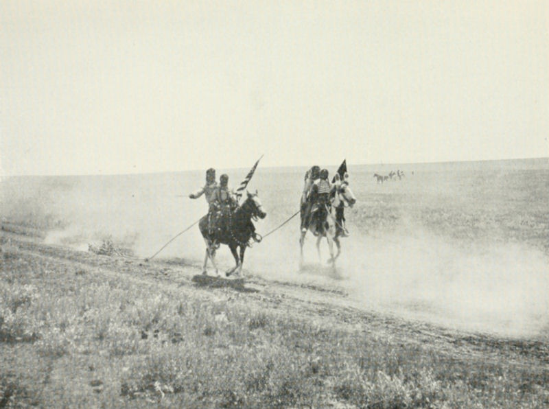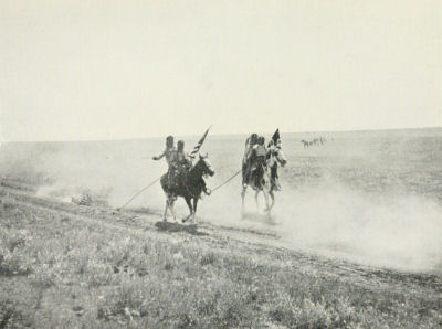 He burnt the grass so that they might think he was coming home after killing the foe. At length they arrived at the village. They tied scalps to a stick. Then those in the village said, “Yonder come those who went to war!” The returning warriors raced around and around as victorious warriors do. People said, “There they are coming home, having killed the people of the enemy.”