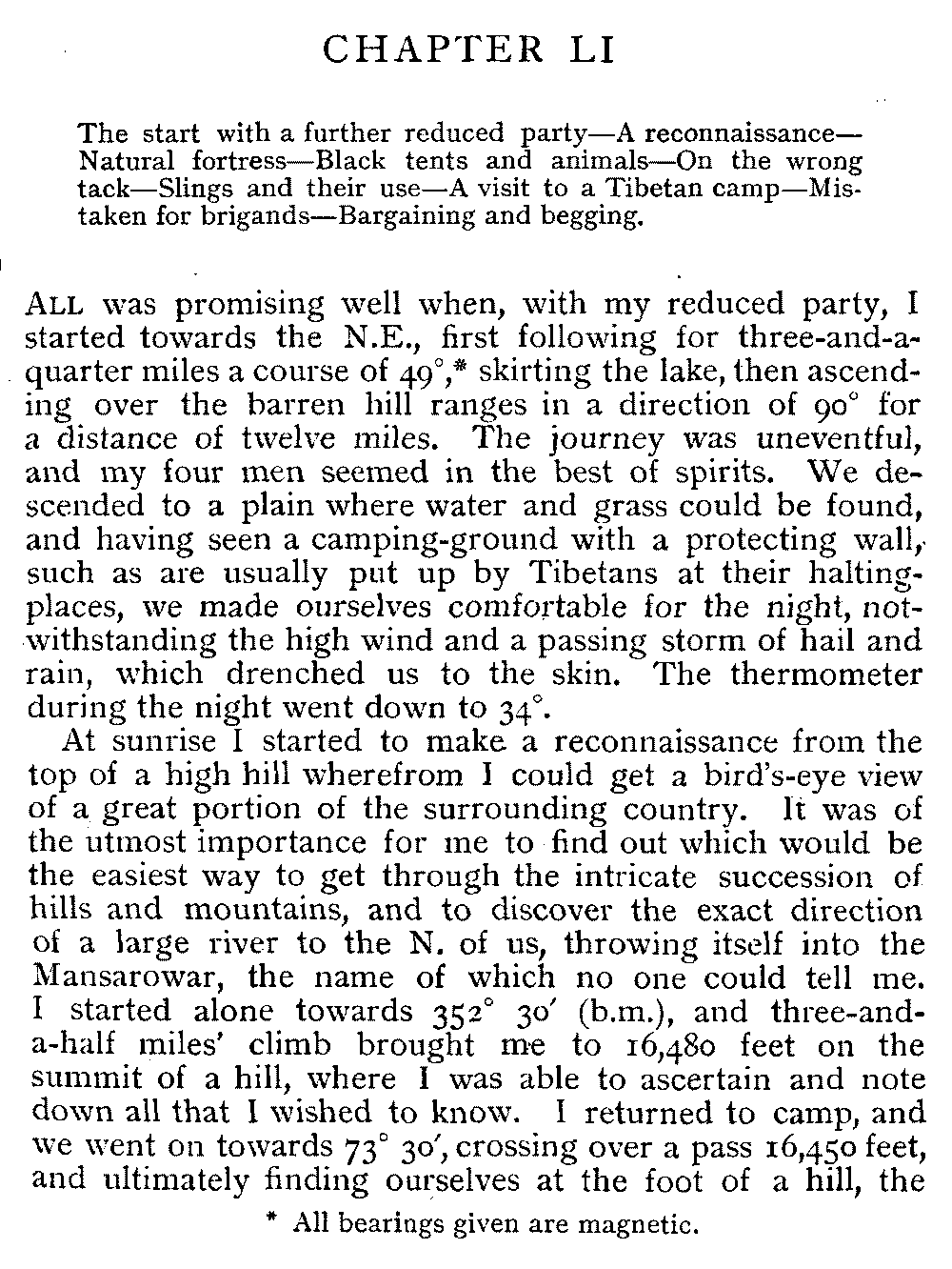 | XLIII | The Langa Tsangpo—A terrific storm—Drenched to the skin—Heavy marching—Against the gods—Difficulty in finding the Lamasery and village—A bark!—Arrival at last—Gentle tapping—Under a roof | 235-238 |