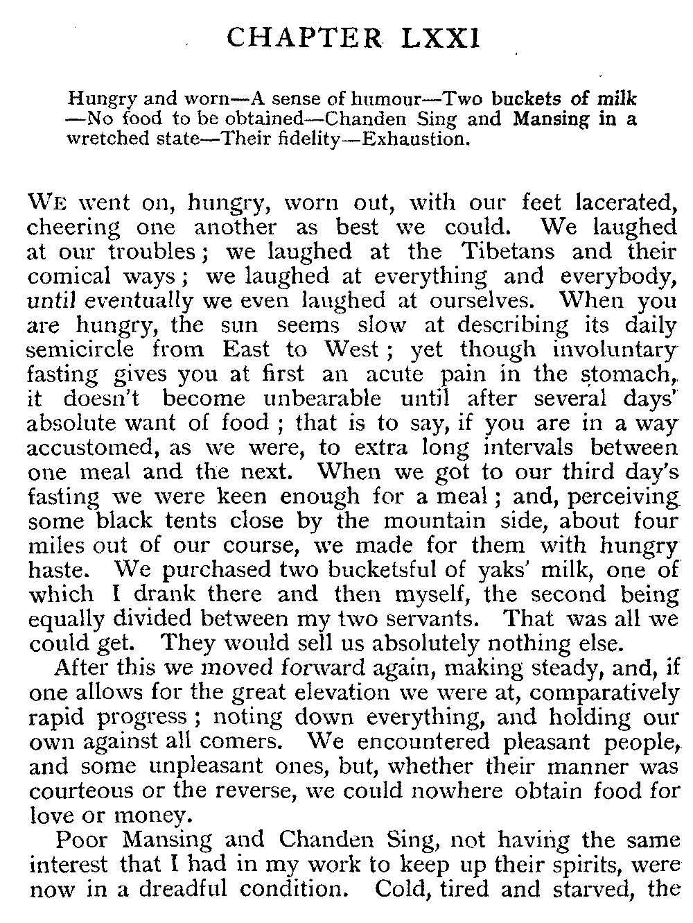 | XXXIII | S.E. wind—Hungry and half frozen—Lakes at 18,960 feet above sea-level—Cold food at high altitudes—Buried in snow—Mansing's sufferings—Fuel at last | 187-191 |