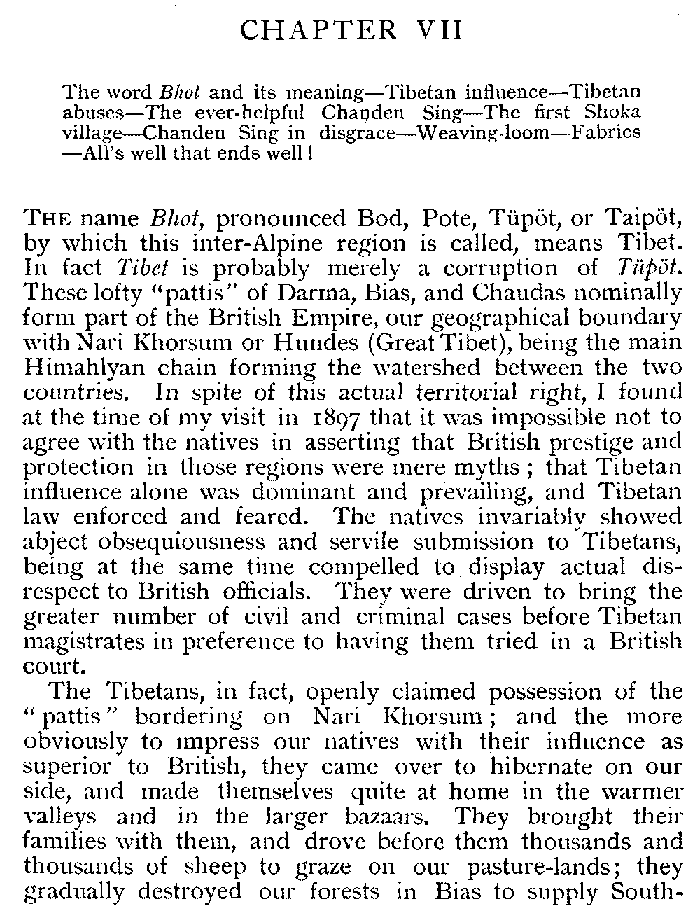 | VII | The word Bhot and its meaning—Tibetan influence—Tibetan abuses—The ever-helpful Chanden Sing—The first Shoka village—Chanden Sing in disgrace—Weaving-loom—Fabrics—All's well that ends well | 41-45 |