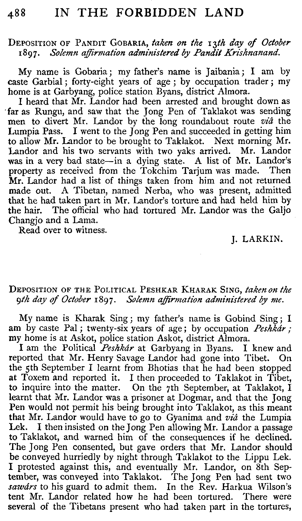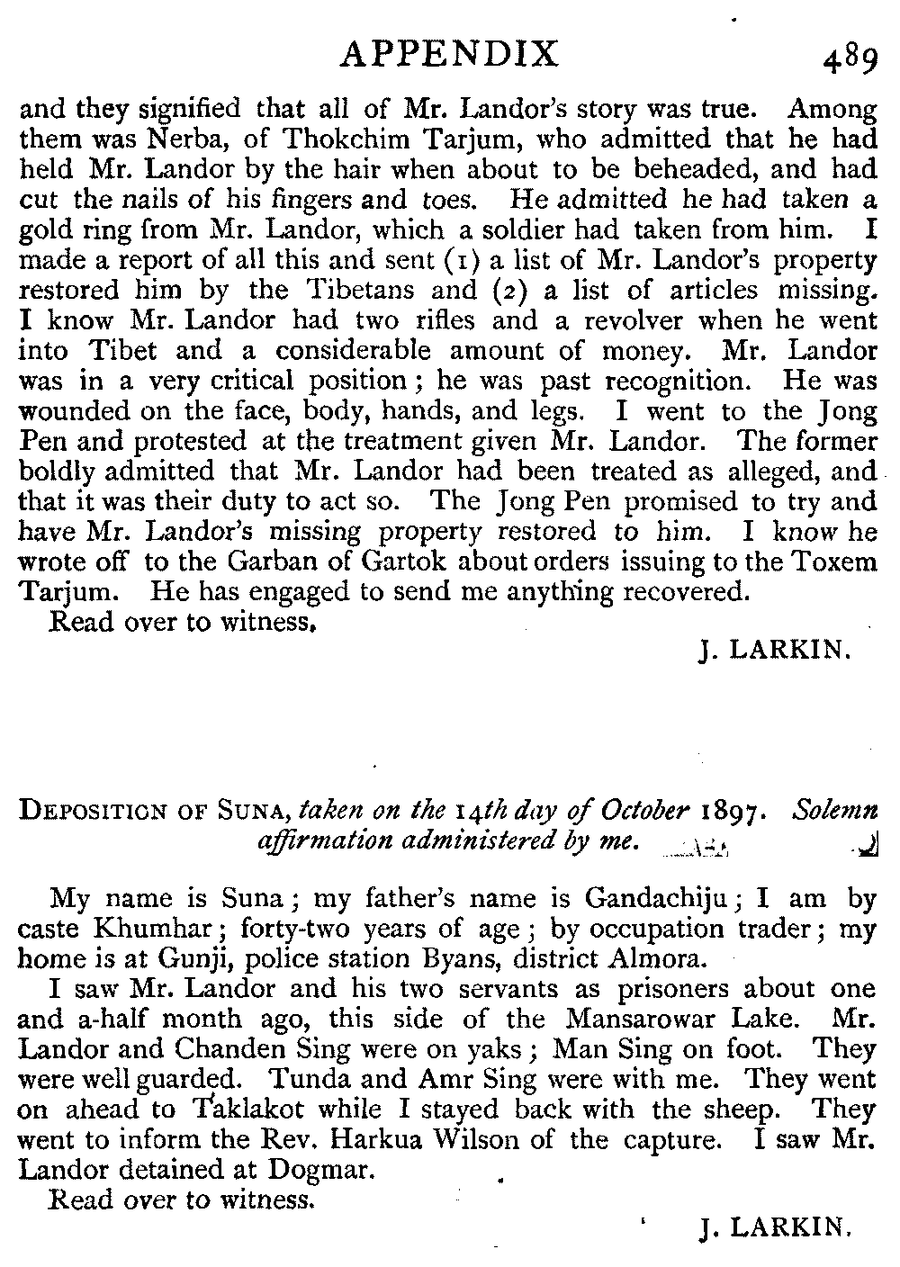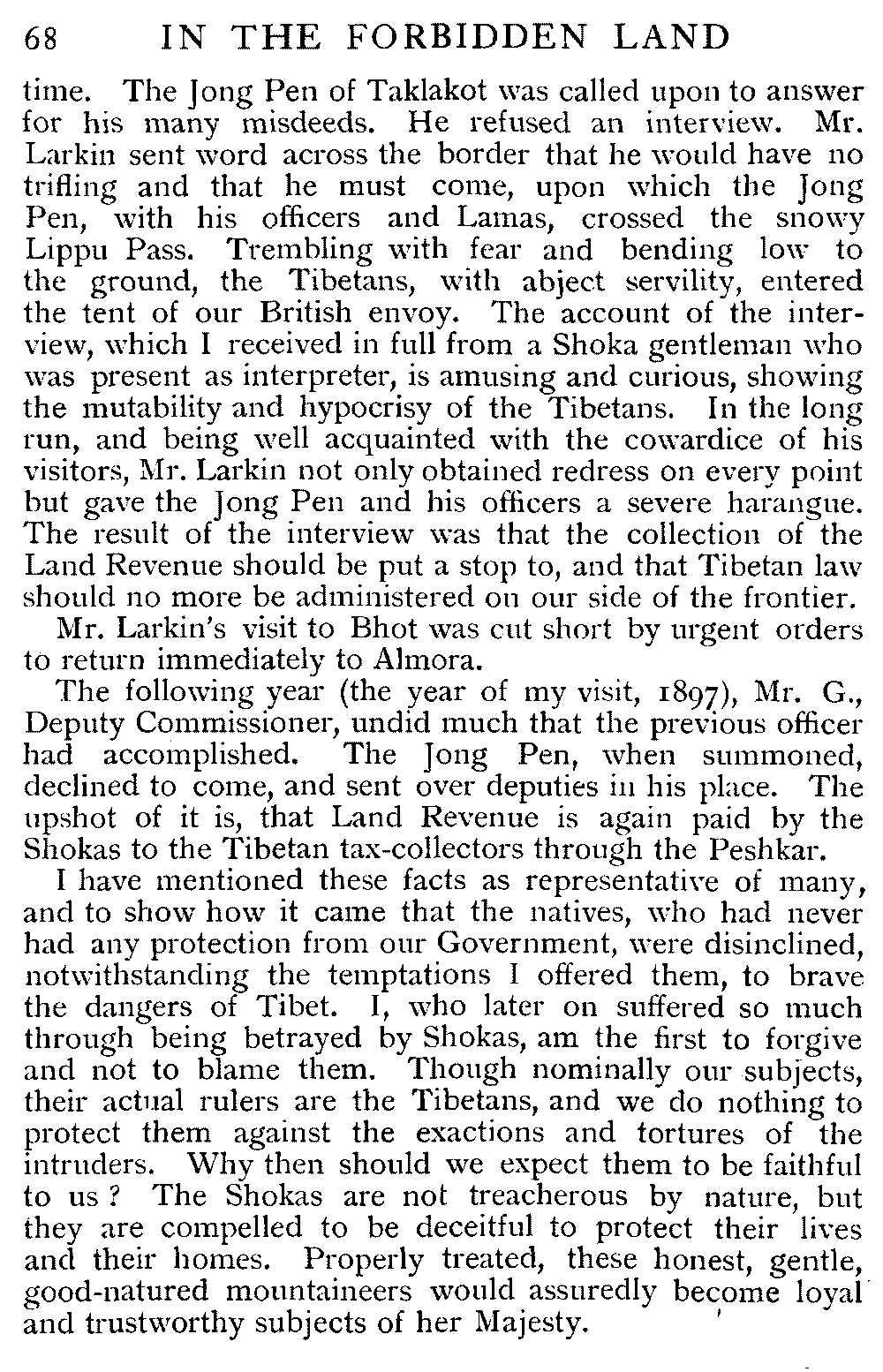 In addition to the above, I am glad to state that owing to the publicity which I gave on my return to the outrageous Tibetan abuses taking place on British soil, the Government of India at last, in the summer of 1898, notified the Tibetan authorities that they will no longer be permitted to collect Land Revenue from British subjects there. This fact gives me special satisfaction, because of the exceptional courtesy and kindness bestowed on me by our mountain tribesmen, the Shokas.
