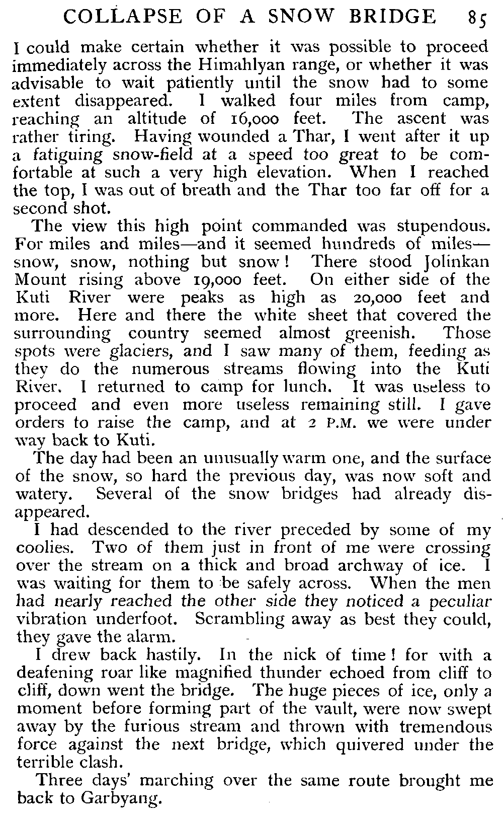 | X | The Nerpani, or "waterless track"—Exaggerated accounts—A long shot—The rescue of two coolies—Picturesque Nature—An involuntary shower-bath—The Chai Pass | 57-62 |