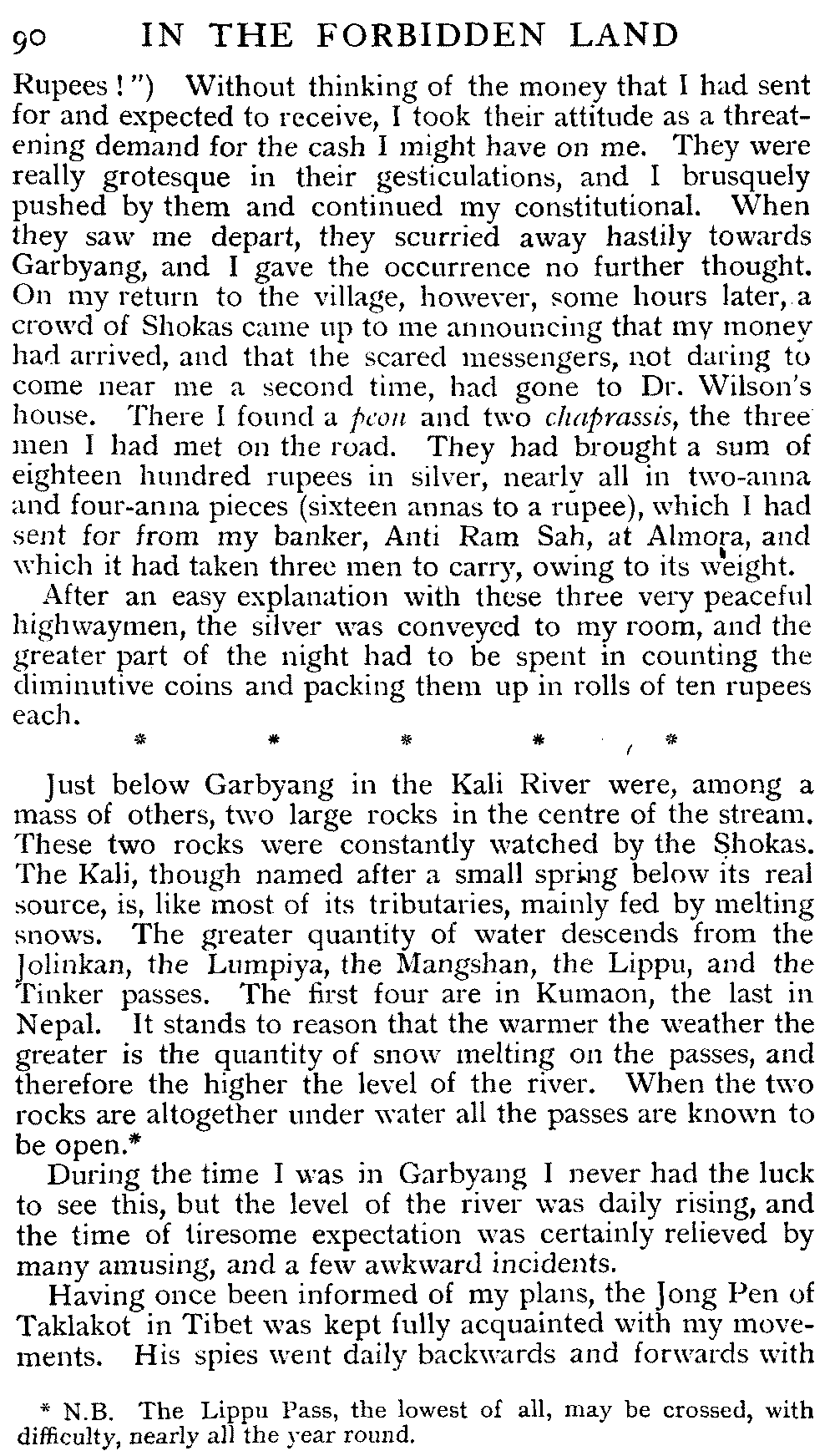 | XXXIV | Dacoits—No nonsense allowed—A much-frequented region—A plateau—The Gyanema-Taklakot track—A dangerous spot—Soldiers waiting for us—Burying our baggage—Out of provisions—A fall into the Gakkon River—A bright idea—Nettles our only diet | 192-197 |