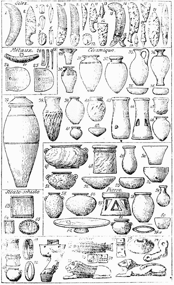 C'est la préhistoire véritable—avec les époques paléolilique et néolithique—et c'est l'industrie qui occupent ici la place principale. Mais, dans cette large fresque de notre plus lointain passé, M. de Morgan a embrassé les âges des métaux, et il a résumé à grands traits ce qu'on peut entrevoir de la vie primitive sous ses divers aspects. Il a dressé ainsi le programme général des civilisations protohistoriques qui seront étudiées en détail dans des volumes spéciaux; et son volume en constitue, pour ainsi dire, le tableau d'assemblage[31].