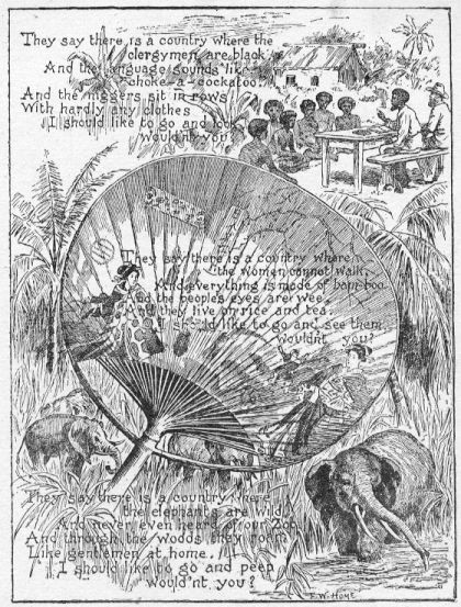 But the bad fairy has set her pygmies to work. One persuades her that she will do her lessons better if she sits in an easy-chair, another puts a cushion at her back, while a third fans her face so gently that the soft breeze, fragrant with honeysuckle and sweetbrier, soon sends her off to sleep, but not to rest. To her dismay the pygmy sweep comes round the corner, and with his sooty brush sweeps the pages of her new atlas. The coalheavers turn over her inkstand upon it, and the black fluid comes streaming down. Aunt Susan's sharp voice calls out, "Mind your dress, you naughty child."