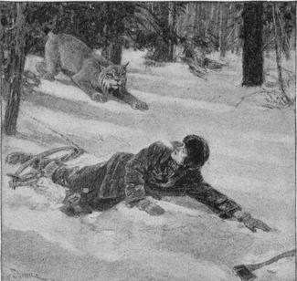 As a rule, the lynx, in common with other wilderness inhabitants, is shy of man; still he is not to be trusted. The winter had been a hard one, game was scarce and the animal was emboldened by hunger. Moreover it seemed to know that the man was crippled. Slowly it advanced, its body almost brushing the snow, its huge furry pads making no sound upon the smooth crust, its unwinking eyes fixed upon those of the man.