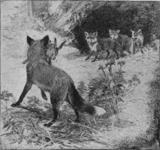He had scarcely turned his back when a sleek, red-brown animal appeared on the ridge a short distance away and with bright eyes watched the skunk until he disappeared around the corner of the building. The fox was acquainted with that building and its contents and at once became interested. Deciding on a closer investigation, he crossed the pasture jauntily, until abreast of the ledge under which the skunk had concealed his trophy. Here he came to an abrupt halt, his nose twitching. There could be no doubt about it. The odour was that of freshly killed fowl.