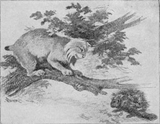 Gray Wolf, leader of the pack, had taken up the trail of a lynx. In an encounter between the two, the latter would scarcely have been a match for the big wolf; but it chanced that soon after Gray Wolf sprang to the attack, the mate of the lynx appeared and joined the fray. Thus the wolf became the victim of a double set of raking claws and sharp teeth. He fought savagely but the claws of the male lynx gashed him horribly from beneath, while its mate bit and tore from above.