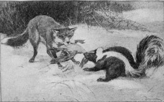 The fox knew well enough with whom he had to deal; nevertheless he was hungry and not inclined to relinquish easily his fat prize. He seized a leg of the duck just as the skunk laid hold of its head. Both glared but refused to let go. It was a comical sight but, not being blessed with a sense of humor, neither animal was aware of this fact. Meanwhile the duck was stretched to an alarming length between them.