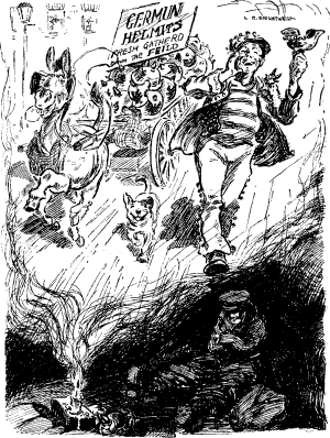 The latest information from the trenches goes to support the maxim that all one requires to wage war is a bold face and a gas helmet. A very distinguished O.C. went up the other day to inspect the trenches of his command and to express such views of their faults and the faults of their inmates as might occur to him from time to time. He had progressed some way up the communication trench, when it struck him that, whereas his recent order had been particularly menacing to everyone of whatever rank who was discovered there or thereabouts without a gas helmet, nevertheless he himself was at that moment innocent of such furniture. Fortunately there came from the opposite direction an odds-and-end private, with nothing in his favour except the wearing of the well-known satchel so much in vogue in Flanders society for the carrying of gas helmets. That was enough for the Commander; this was essentially one of those privates to be called "My man," and treated as such. Politely but firmly he was requested to part with his satchel as a temporary loan to his General. Firmly, if respectfully, he refused to comply. Them was his orders. The Commander congratulated him on his very proper attitude, explained to him the nature of the higher commands and demanded the satchel. The man looked like being stony about it, but the Commander became irresistibly commanding and got the satchel at last. He buckled it on, and the party proceeded, characterising the reluctance of the private to part with his treasure as almost an exaggerated sense of obedience to printed orders.