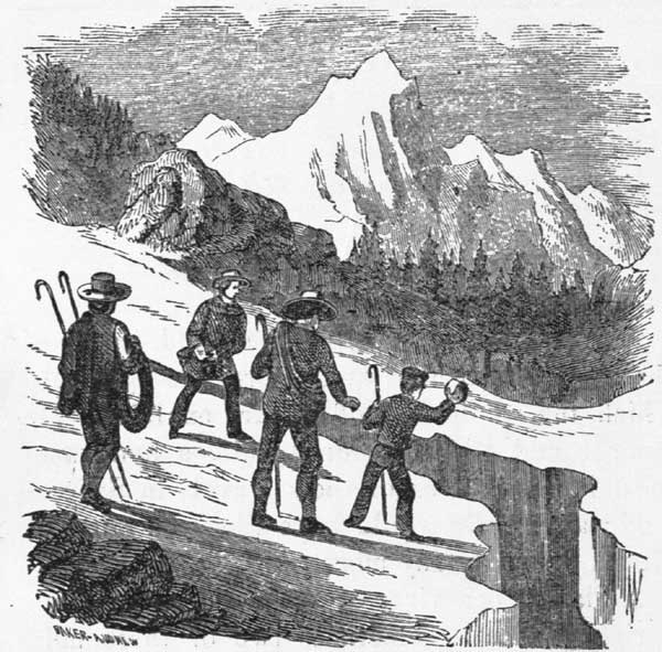 It is not possible to describe in such a volume as this more than a small part of the excursions which Mr. George and Rollo made or the adventures which they met with in the course of their tour in Switzerland. They remained in the country of the Alps more than a fortnight; and they enjoyed, as Rollo said, every moment of the time. There was no end to the cascades and waterfalls, the ice and snow-clad summits, the glaciers, the romantic zigzag paths up the mountain sides, the picturesque hamlets and cottages, and the groups of peasants toiling in the fields or tending flocks and herds in the higher pasturages. Rollo's heart was filled all the time that he remained among these scenes with never-ceasing wonder and delight. The inns pleased him, too, as much perhaps as any thing else; for the climbing of mountains and the long excursions on foot gave him a most excellent appetite; and at the inns they always found such[Pg 221] nice breakfasts, dinners, and suppers every day that Rollo was never tired of praising them.