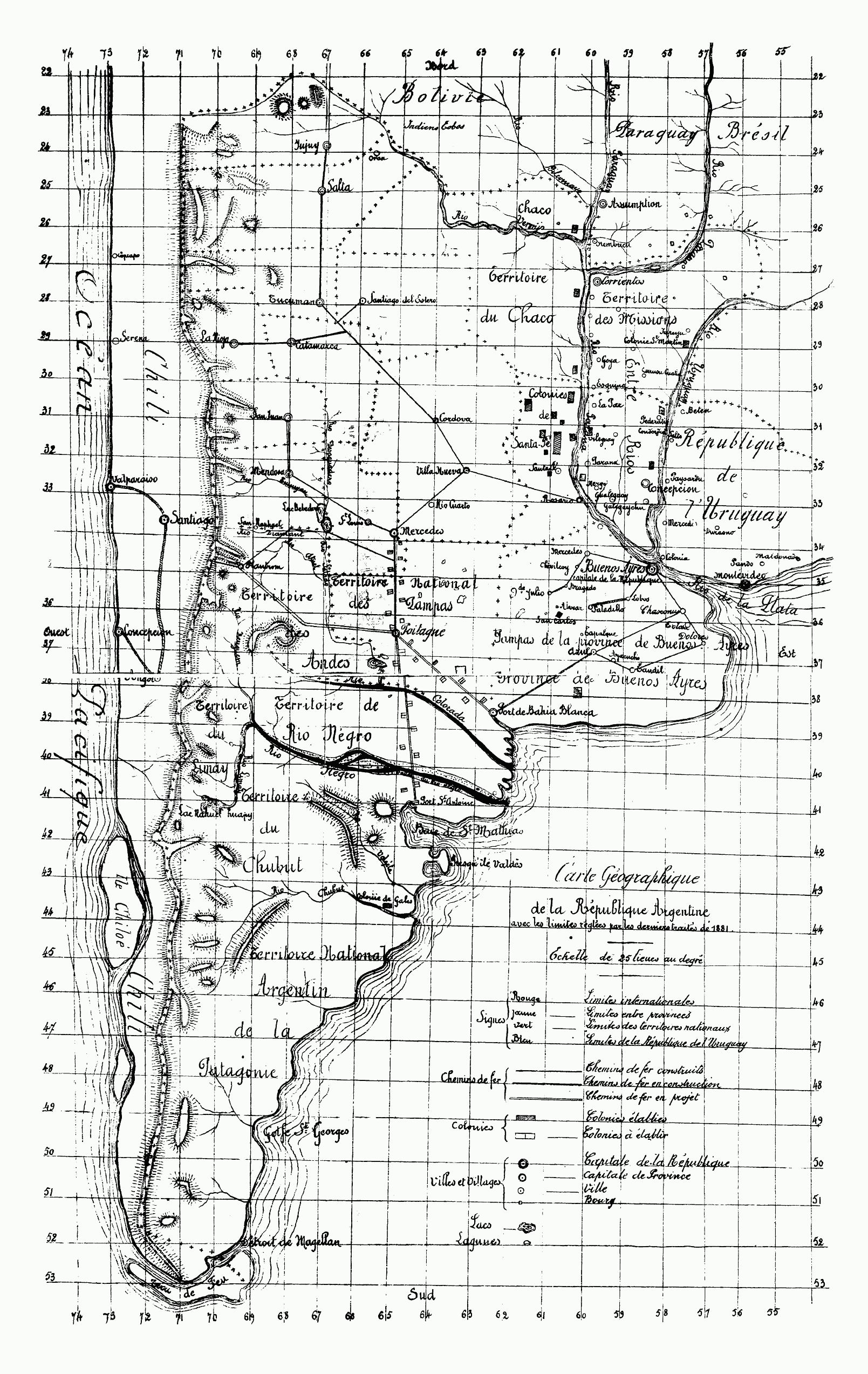 Les questions d'ordre politique intérieur ont été résolues par la constitution fédérale de 1853, qui maintient unies les quatorze provinces argentines, sous la protection d'un gouvernement national fort et respecté, disposant de la force publique et de toutes les ressources nationales. La question de la capitale de la République, qui a tenu durant vingt ans les Argentins dans un état d'agitation passionnée, a été résolue, il y a deux ans, par la cession au gouvernement national de la riche cité de Buenos-Ayres, avec ses trois cent mille habitants, ses établissements publics, ses immenses ressources et son port de commerce visité chaque année par les navires de toutes les nations du globe. Les Indiens, qui occupaient l'immense et fertile plaine des Pampes et qui, durant des siècles, furent la terreur des éleveurs de bétail des provinces de Buenos-Ayres, Santa-Fé, Cordova, Saint-Louis et Mendosa, ont disparu et sont tenus à distance par la ligne militaire de la frontière, à la suite d'une expédition armée, habilement dirigée par le général Roca, Président actuel de la République. Huit mille Indiens avec leurs caciques faits prisonniers, un grand territoire conquis, la confiance rétablie parmi les éleveurs de bétail des provinces voisines... tels ont été les résultats de cette heureuse et importante expédition sur les Indiens, dont la race tend à disparaître sous l'action de la misère et de la maladie. Enfin, la question des frontières avec le Chili, qui, depuis soixante ans, préoccupaient les esprits de l'un et de l'autre côté des Andes, s'est terminée par un traité de limites signé en juillet 1881.