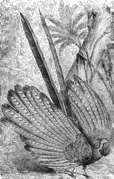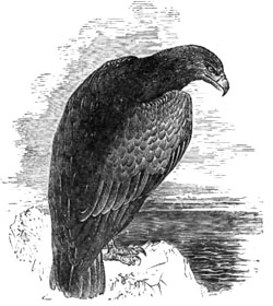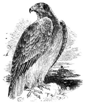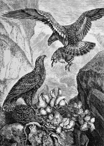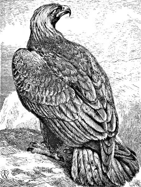The most powerful of the eagles is the Golden Eagle, so called because of the rich yellowish-brown bordering to its feathers. It makes its nest in the clefts of the rocky sides of the mountains, and seldom on a tree, unless where one has sprung up in between the clefts, and the tangled roots make a sort of platform. This the eagles cover with sticks, and here they make their house, living in it always, and not only when they lay eggs or have young ones.