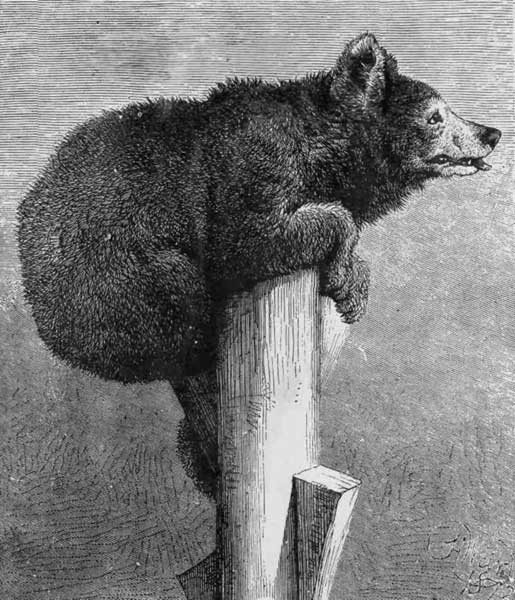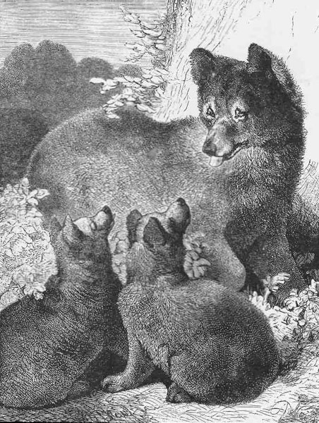 IS is the American black bear, who is looking so lively and seemingly inviting the young folks to have a romp, which they will be only too willing to join in. The black bear is of a timid disposition, and seldom attacks man except in self-defense. The female bear is a most affectionate mother, and many stories are related showing her care and love for her young, and her sorrow and mournful cries when any evil befalls them. On one occasion a black bear with her two cubs was pursued across the ice by some armed sailors. At first she urged her cubs to increased speed, but finding her pursuers gaining upon them, she carried, pushed, and pitched them, alternately, forward, until she effected their escape from her pursuers.