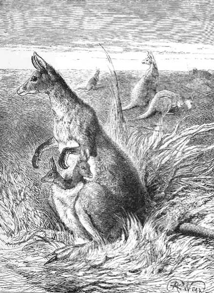 ELL,” said little Herbert Joyce, as he looked over the books of drawings which his cousin had just brought home from Australia, “I never saw anything so extraordinary before in all my life; why here is an animal with three heads, and two of them are very low down, and much smaller than the others.” “What do you mean, Herbert?” asked his cousin, who just then came into the room. “There are no three-headed animals—let me see the picture. Oh! no wonder you were puzzled; it does look like a queer creature. That is a kangaroo, and the small heads belong to her children, whom she carries about in a bag formed by a hole in her skin, until they are old enough to walk; and the little things seem very happy there; and sometimes, as their mother moves along over the grass, you may see them nibbling it.”