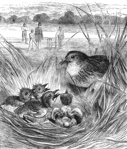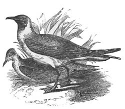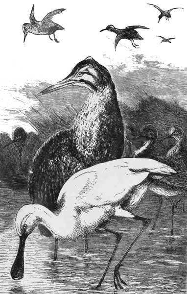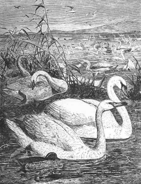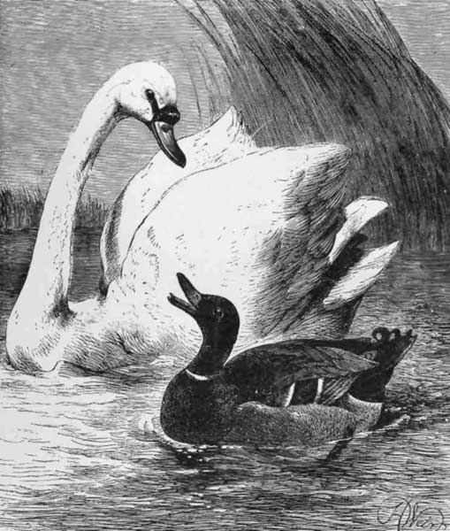 HIS beautiful and majestic bird was considered the bird-royal in England, owing to a law of England that when found in a partially wild state on the sea and navigable rivers it belonged to the crown; but of course it is to be found on the ponds and lakes of many a gentleman's estate, and is always prized as a great ornament to the lake. The swan is also very valuable in clearing the ponds of weeds, and makes a most effective clearance, as they eat them before they rise to the surface. The swan affords a pleasing illustration of the love of the mother-bird for its young, and has been known to vanquish a fox who made an attack on its nest—showing that the instinct of motherhood kindles boldness and bravery in the breast of the most timid animals. The nest is generally made on an islet, and composed of reeds and rushes, and when the five or seven large eggs are hatched, the mother may be seen swimming about with the young ones on her back.
