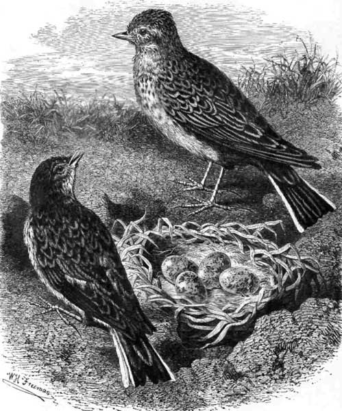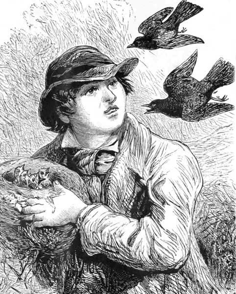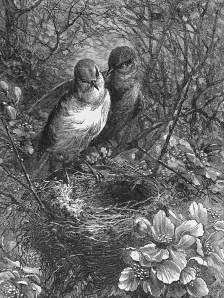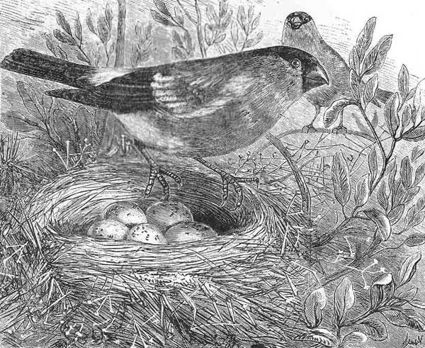 OW curious is the structure of the nest of the Bullfinch or Chaffinch! The inside of it is lined with cotton and fine silken threads; and the outside cannot be sufficiently admired, though it is composed only of various kinds of fine moss. The color of these mosses, resembling that of the bark of the tree in which the nest is built, proves that the bird intended it should not be easily discovered. In some nests, hair, wool, and rushes are cleverly interwoven. In others, the parts are firmly fastened by a thread, which the bird makes of hemp, wool, hair, or, more commonly, of spiders' webs. Other birds—as, for instance, the blackbird and the lapwing—after they have constructed their nests, plaster the inside with mortar; they then stick upon it, while quite wet, some wool or moss to give warmth; but all alike construct their nests so as to add to their security.