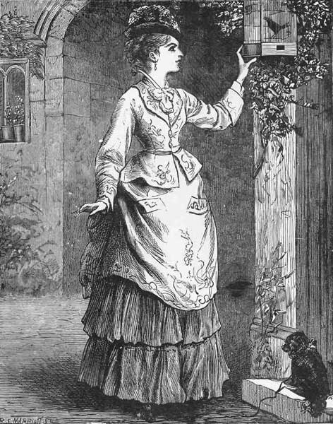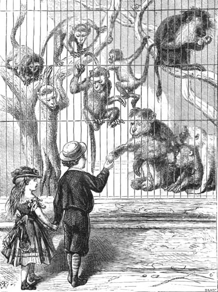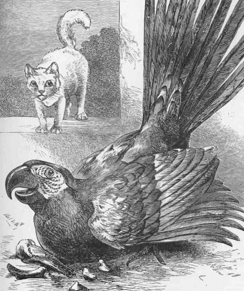 ACKO is a bird called a Macaw, and has fine feathers—scarlet and yellow and blue. Jacko can talk a little. He says, “Come along, Jacko, come along;” and when you come, as soon as he thinks you near enough, he pecks at you with his great beak. When he is in a good temper he will say, “Poor, poor!” He will sit upon the ivy all the morning and talk to himself, and he will call the gardener, and he will cough and sneeze, and crow and cackle, in a very funny manner. If Jacko sees sparrows picking up a few crumbs, he will rush up, sweeping his great wings along the ground, and take their meal for himself. If he sees poor Pussy picking a bone, he takes great delight in creeping down from his ivy, helping himself down with beak and claws, and at a sight of Jacko's approach Pussy darts away, leaving the bone in Jacko's possession. Pussy, of course, does not like this, but stands at a respectable distance, and with curved back and flashing eyes shows her indignation at Jacko. Presently Jacko retires to the ivy and Pussy resumes her feast.