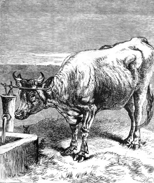 Y informant writes me as follows: “We have a wonderful cow here—about ten years old, and very clever at opening gates and breaking fences. There is an Abyssinnian pump about three feet high in the center of the field, near my house, over a trough, which is, or ought to be, filled daily. It was on a hot day, when my man had omitted to pump the trough full, that the cow was first observed to help herself: the way in which she managed to pump was by pushing the handle up with her head and then forcing it down with her horns. Very little elevation of the handle is required to get water, and she would work it for five minutes together, and sometimes drank from the spout, and sometimes from the trough.”