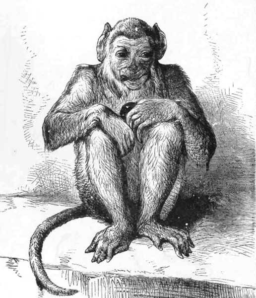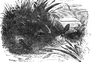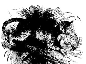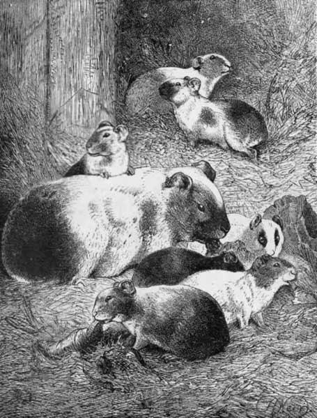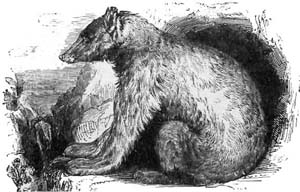 NE day at the Zoological Gardens, I saw the group of Badgers as they are here given. Little do visitors to the gardens take into account how much a wild animal goes through till it has got used to a state of things so opposite to its natural habits. Their wants are attended to as much as possible, but cannot be always met; and so we have here a devoted mother, worn out by the demands of her cubs, and vainly anxious to hide herself from daylight and man's gaze. She has long given up trying to dig or scratch her way out. All she can do is to lean against the wall, ready for a last defence, should anybody come within her prison. She dares not curl up into a ball, like the one cub, and go to sleep; while this little careless imp on her back, happy and trustful, adds to her tiredness by his weight.