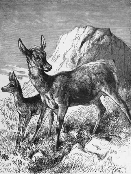 HE chamois are indeed high-born, for among the high mountain-peaks, where the eternal snow rests and the Alpine roses bloom, there they make their home! There they spring up over the snowy slopes to those heights to which man cannot climb. They rest upon the glittering ice, the snow does not blind them, neither does it cool their hot blood. Carelessly they stride across the snowed-over crevices, and when the terrible storms, at which men are so alarmed, hurl down rocks and avalanches from the summits, the Chamois do not fear them. They find their way safely through the thickest mist and darkest clouds. Agile and light-footed, gentle and peaceable, proud and courageous, they lead a happy life among the mountains, as long as man does not molest them.
