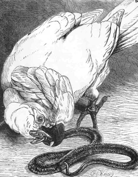 If its enemy gets above it, and upon or near its body, it defends itself vigorously with its long and powerful beak, and often comes off victorious.