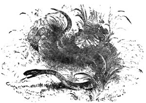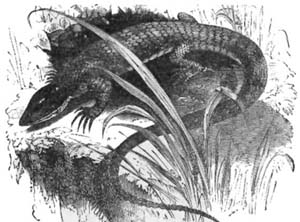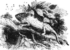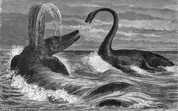 The other huge reptile was the Plesiosaurus, the meaning of which is “Near to a Reptile.” Its structure was very singular and its character very strange. In the words of Buckland: “To the head of a lizard, it united the teeth of the crocodile, a neck of enormous length, resembling the body of a serpent, a trunk and a tail of the size of an ordinary quadruped, the ribs of a chameleon, and the paddles of a whale.”