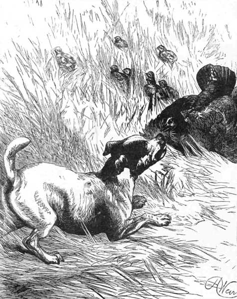 NE afternoon, while walking across a meadow, near a village, I saw a dog of the terrier breed pursuing a partridge, which every now and then turned and made at it with its wings down, then rolled over, then ran, and again rushed at the dog. I drove the dog away, when I was surprised to see a number of young partridges running from behind the old bird who had been trying to protect them from the dog, and guarding their retreat. So you see how brave the most timid creatures become when in danger, and when their young are near. Instinct tells them that they have to protect their little ones, and risk everything, even their own lives, for their safety. We can get beautiful lessons every day from the birds and poor dumb animals, if we only study them as we ought.