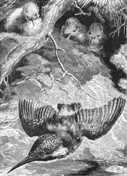 When he built his nest he took care that it should be near a stream, and he found one close by a high cliff that Mrs. Kingfisher said would be just the place; so they scooped out a deep hole, and there the eggs were laid, and in due time six little Kingfishers burst out of the shells.