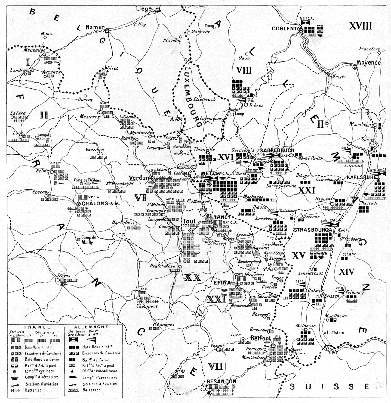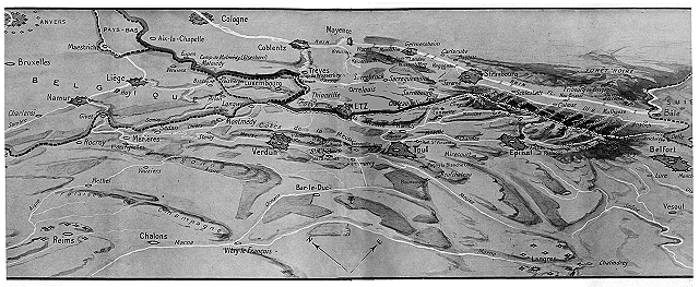Notre front des Vosges est considéré comme à peu près infranchissable; les Allemands devaient donc songer à utiliser la grande voie de pénétration que constitue la frontière germano-belge et germano-luxembourgeoise, entre Aix-le-Chapelle et Longwy.