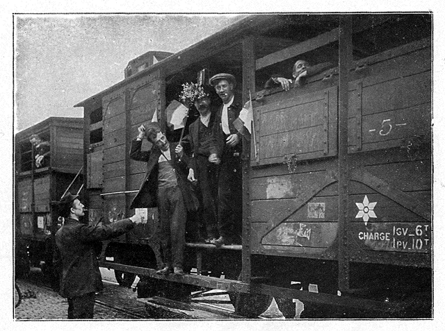 Etampes.--Les premiers soldats en tenue de campagne. Une centaine qui déchargent sur le quai des caisses de fusils et des boîtes de cartouches. Ils sont vifs, simples et gais dans la fraîcheur du matin. Un peu plus loin, vers Ablon, nous dépassons un train de cuirassiers qui va comme nous sur Paris. Par les glaces ouvertes, les bras des cavaliers nous font des signes de joie et d'amitié, et les visages de ces beaux hommes aux larges épaules rayonnent de confiance et de force.