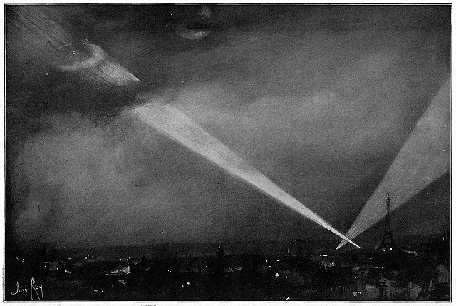 Parmi les hypothèses d'un genre nouveau qu'a dû envisager notre état-major, il en est une assez curieuse, et un peu inquiétante, bien qu'il n'en faille point exagérer l'importance. Un dirigeable allemand, dans un raid audacieux, ne pourrait-il, à la faveur de la nuit, arriver jusqu'au Champ-de-Mars et lancer quelques bombes sur la tour Eiffel, avec l'espoir d'en détruire une partie suffisante pour arrêter le fonctionnement de notre poste de télégraphie sans fil? Des mesures spéciales sont prises pour se défendre contre pareille tentative: à Paris même et sur divers points du territoire on a disposé des pièces d'artillerie efficaces; des aviateurs veillent aux environs de la capitale, prêts au suprême héroïsme; et c'est pour cela que chaque soir on voit courir sur le ciel parisien de larges faisceau lumineux qu'un dirigeable pourrait difficilement éviter, et qui, par une singulière ironie du destin, rappellent les projections qui illuminent Paris les jours de fête.