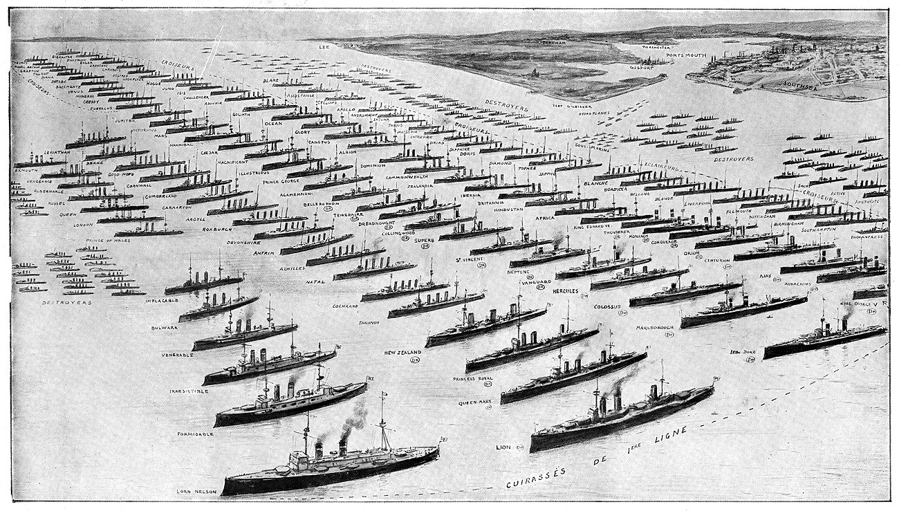 Les 24 dreadnoughts, les 35 pre-dreadnoughts, les 18 croiseurs cuirassés et les 100 autres navires, qui furent rassemblés à Spithead, le 18 juillet, pour une revue navale sans précédent, et qui sont maintenant mobilisés pour protéger les côtes de la Grande-Bretagne et de la France, et poursuivre les escadres allemandes.
