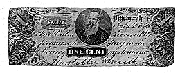 C'est presque une vérité de La Palice d'affirmer que les petites coupures présentent les mêmes garanties que les grosses; elles ont, sur ces dernières, l'avantage de faciliter les transactions. Et nombre d'Etats qui, pendant un temps plus ou moins long, se sont vus obligés de recourir au papier-monnaie, ont émis des coupures d'un franc. Il n'y a pas longtemps encore, la République Argentine utilisait des billets de 5 centouros, valant environ deux sous et demi. Mais le record en ce genre semble appartenir à la Banque de Pittsburg qui, en 1859, pendant la guerre de Sécession, émit des billets de banque de 1 cent, soit un sou, dont nous reproduisons un spécimen qui nous est gracieusement communiqué par M. Fernand Bernard.