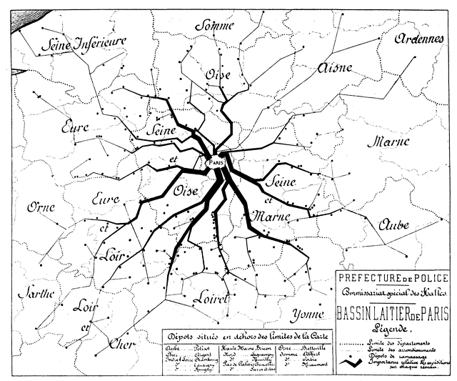 Carte schématique des arrivages de lait à Paris en temps ordinaire.