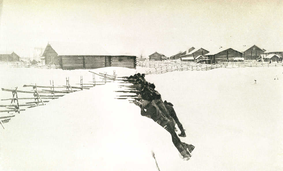 In the rainy fall season by their dash and valor they were to expel the Red Guards from the cities and villages of the state of Archangel, pursuing the enemy vigorously up the Dvina, the Vaga, the Onega and the Pinega Rivers, and up the Archangel-Vologda Railway and the Kodish-Plesetskaya-Petrograd state highway. They were to plant their entrenched outposts in a great irregular horseshoe line, one cork at Chekuevo, the toe at Ust-Padenga, the other cork of the shoe at Karpagorskaya. They were to run out from the city of Archangel long, long lines of communication, spread wide like the fingers of a great hand that sought seemingly to cover as much of North Russia as possible with Allied military protection.