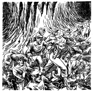 The pilot and one of the nondescript men were the first over. They were into the river of fire before they knew, it, and then it was too late. One collapsed and was buried. The pilot fell backward, and then other man died under his body, of a broken neck.